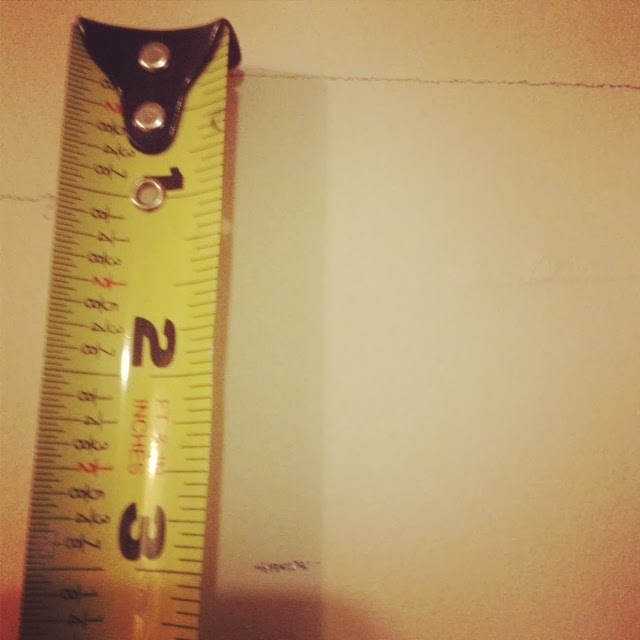 Step 5: Because I placed my eye hooks three inches below the top of my frame, I had to measure three inches below my original pencil mark. If you put your eye hooks five inches below the top of your frame, measure five inches below your line and mark with a pencil.